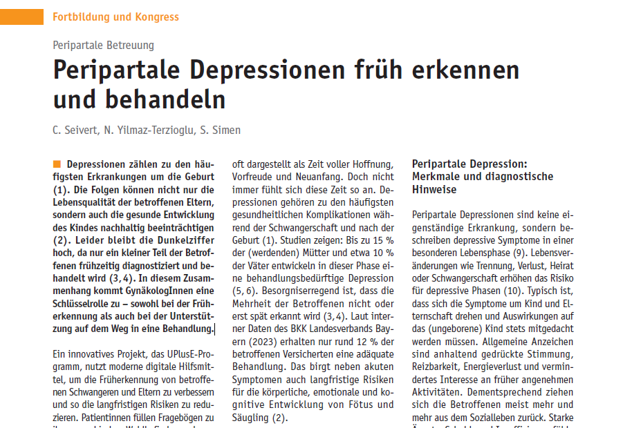 Im Rahmen der vergüteten digitalen Screeningstudie UPlusE sollen Schwangere und junge Mütter mit depressiver Symptomatik früh erkannt und einer bedarfsgerechten Therapie zugeführt werden. Die erfahrene Frauenärztin Dr. med. Neslisah Yilmaz- Terzioglu berichtet über ihre mehrjährigen positiven Erfahrungen mit den Screenings, der Compliance und den Interventionen, welche im Nürnberger Pilotprojekt für UPlusE entwickelt und evaluiert wurden.